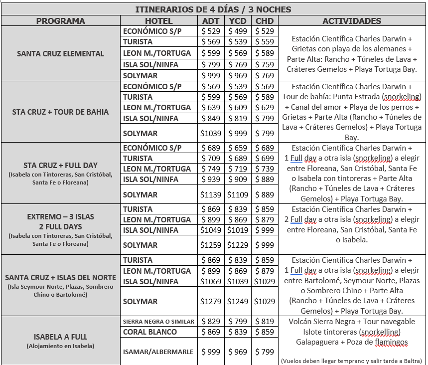 TARIFARIO GALÁPAGOS BLOQUEOS 2025 SALIDAS DESDE GUAYAQUIL Y QUITO