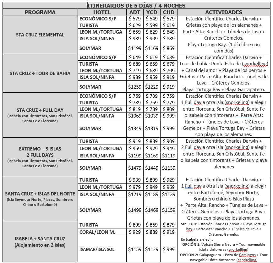 • Itinerario sujeto a cambios por problemas climatológicos, inconvenientes de tipo operativo o situaciones que pongan en peligro la integridad del pasajero o la conservación de las Islas. Como también por indicaciones de autoridades que administran el Parque Nacional Galápagos.